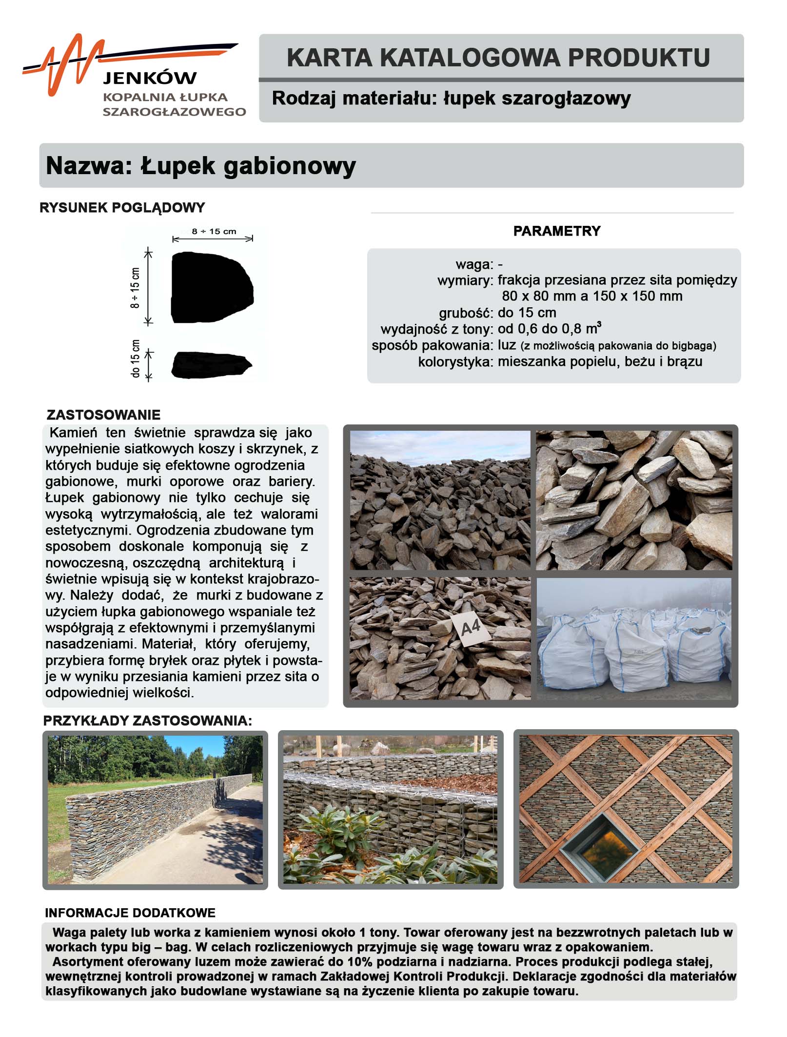 Sprzedawany jest on  w formie luźnej . Jest to odpowiednio przesiany kamień o frakcji 80 mm-150 mm, idealny do wypełniania koszy gabionowych , ogrodzeń gabionowych itp..