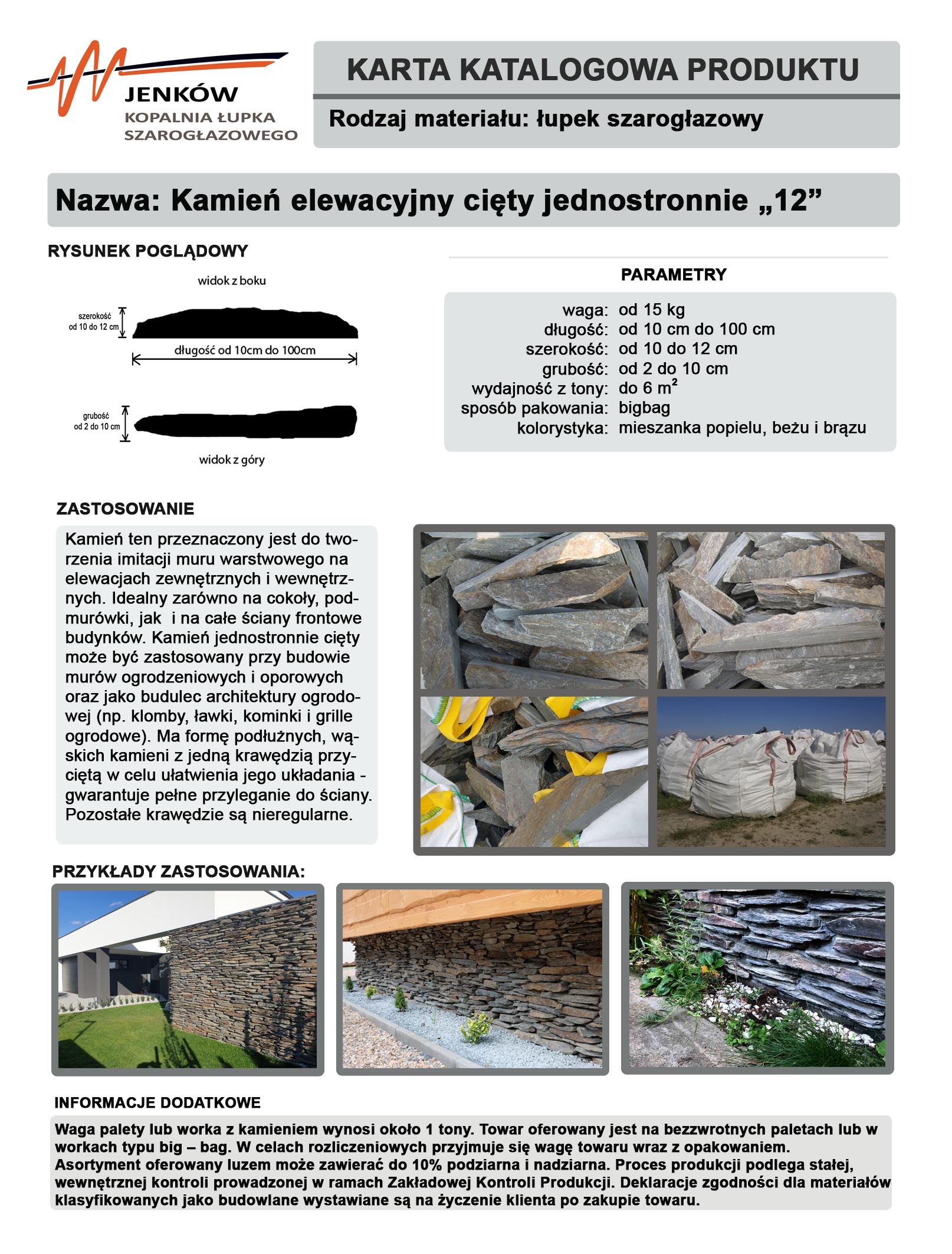 Kamień występuje w formie płytkowej. Jedna krawędź jest cięta w celu ułatwienia jego układania – gwarantuje pełne przyleganie do ściany. Pozostałe krawędzie są nieregularne. Kamień jednostronnie cięty może być zastosowany przy budowie: murów warstwowych i oporowych oraz kominków i grilli ogrodowych. Jest to zarówno kamień elewacyjny jak i kamień murowy.